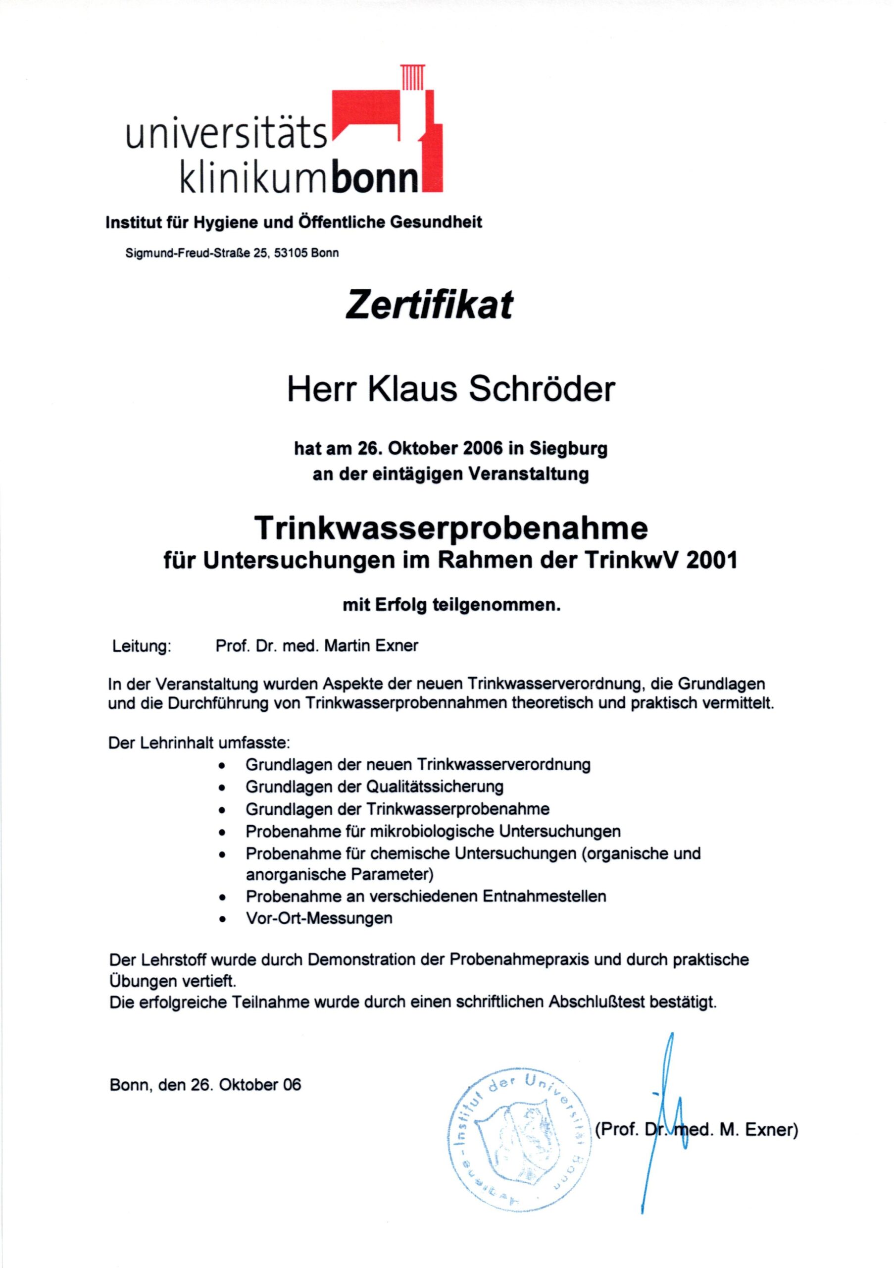 Gemeinsam mit Uni Bonn und Wahnbachtalsperren-Verband wurden Trinkwasser-Hygiene-Projekte umgesetzt, z. B. auch als Trinkwasser-Probennehmer.